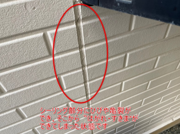 亀裂・ひびがさらに進んだ状態です。本来シーリング材と外壁材はくっついた状態で雨の侵入が防げますが、外壁とシーリングが離れてはがれ/隙間ができた状態です。劣化具合としては末期になります。