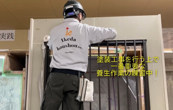 まずは、塗装工事を行う上で、一番重要な養生作業の練習からスタートします。
