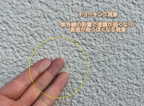 紫外線の影響で塗膜が弱くなり、表面が粉っぽくなる現象です。
